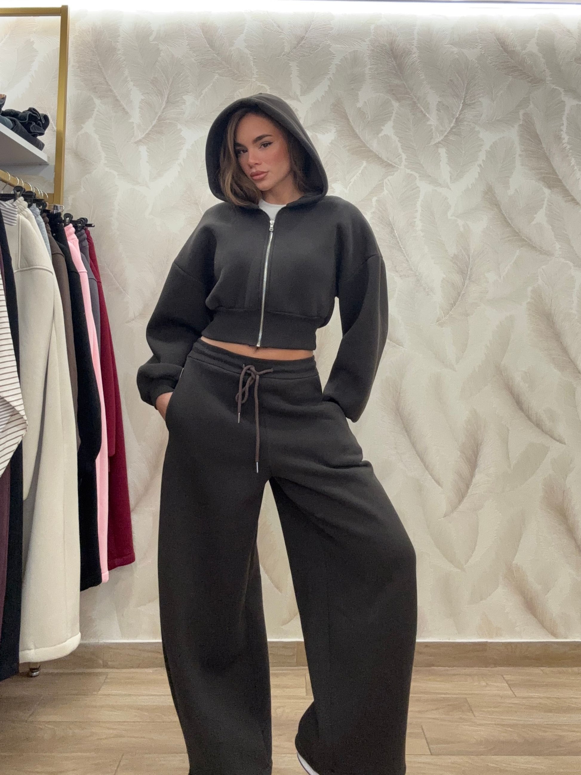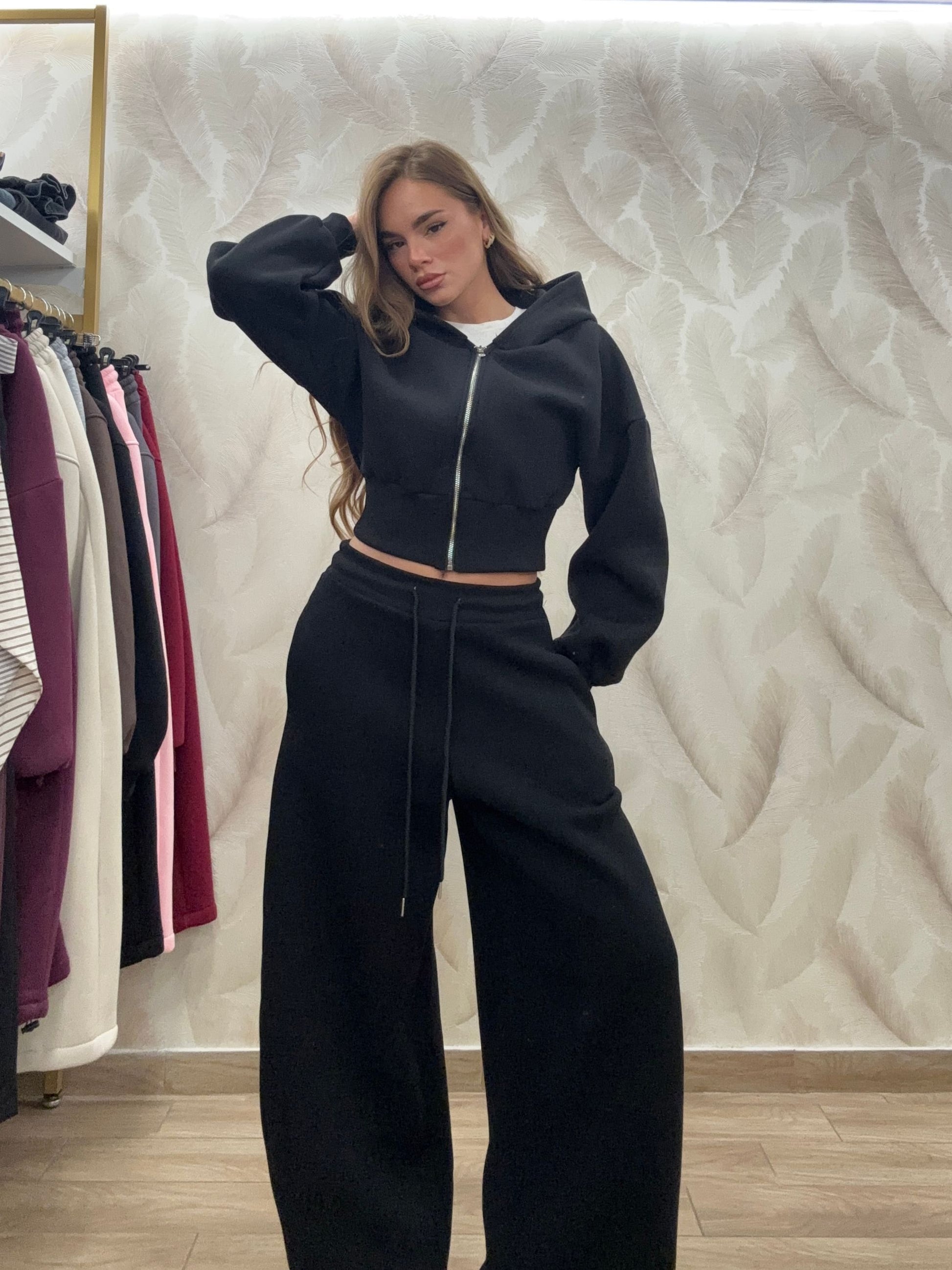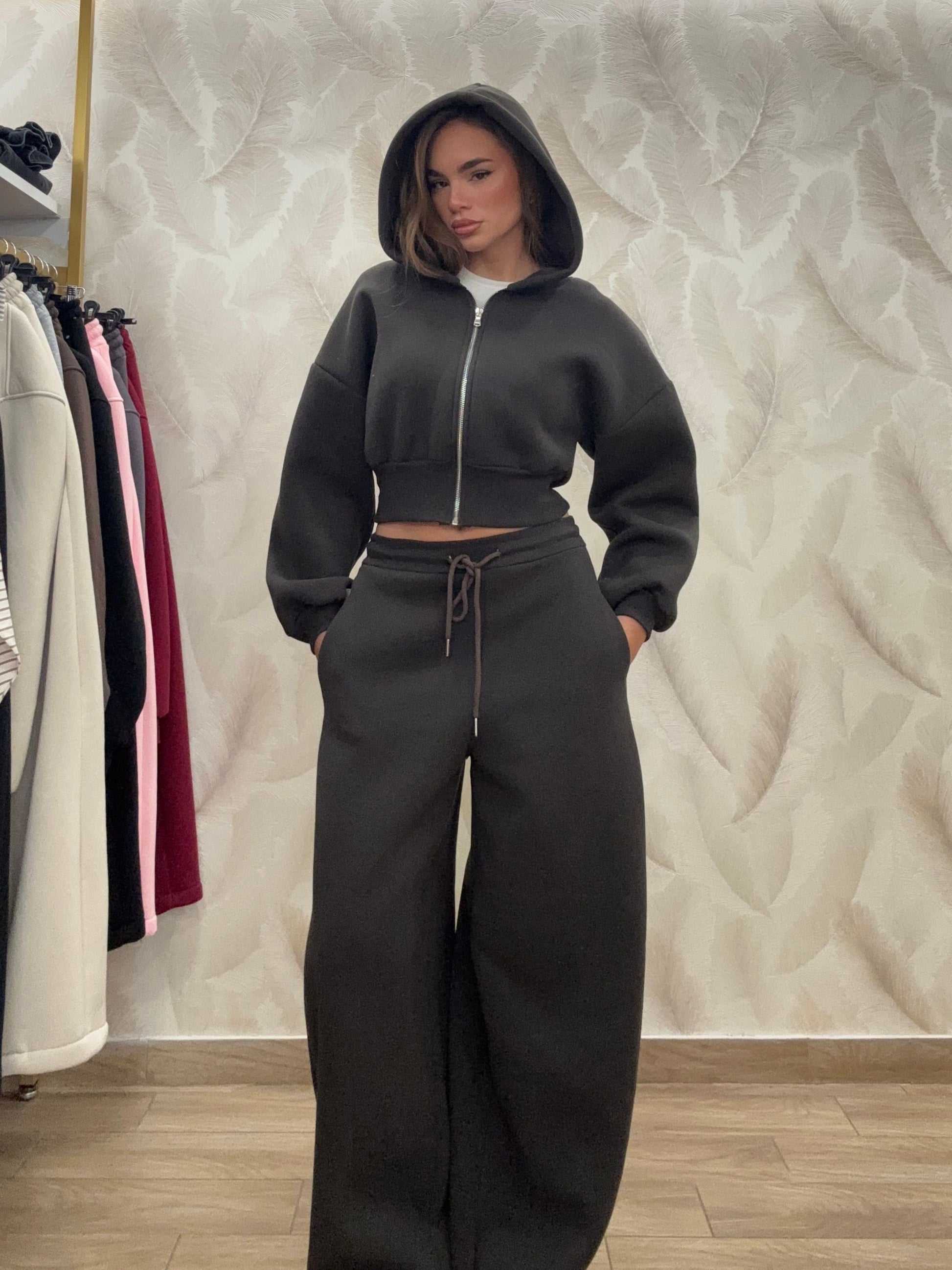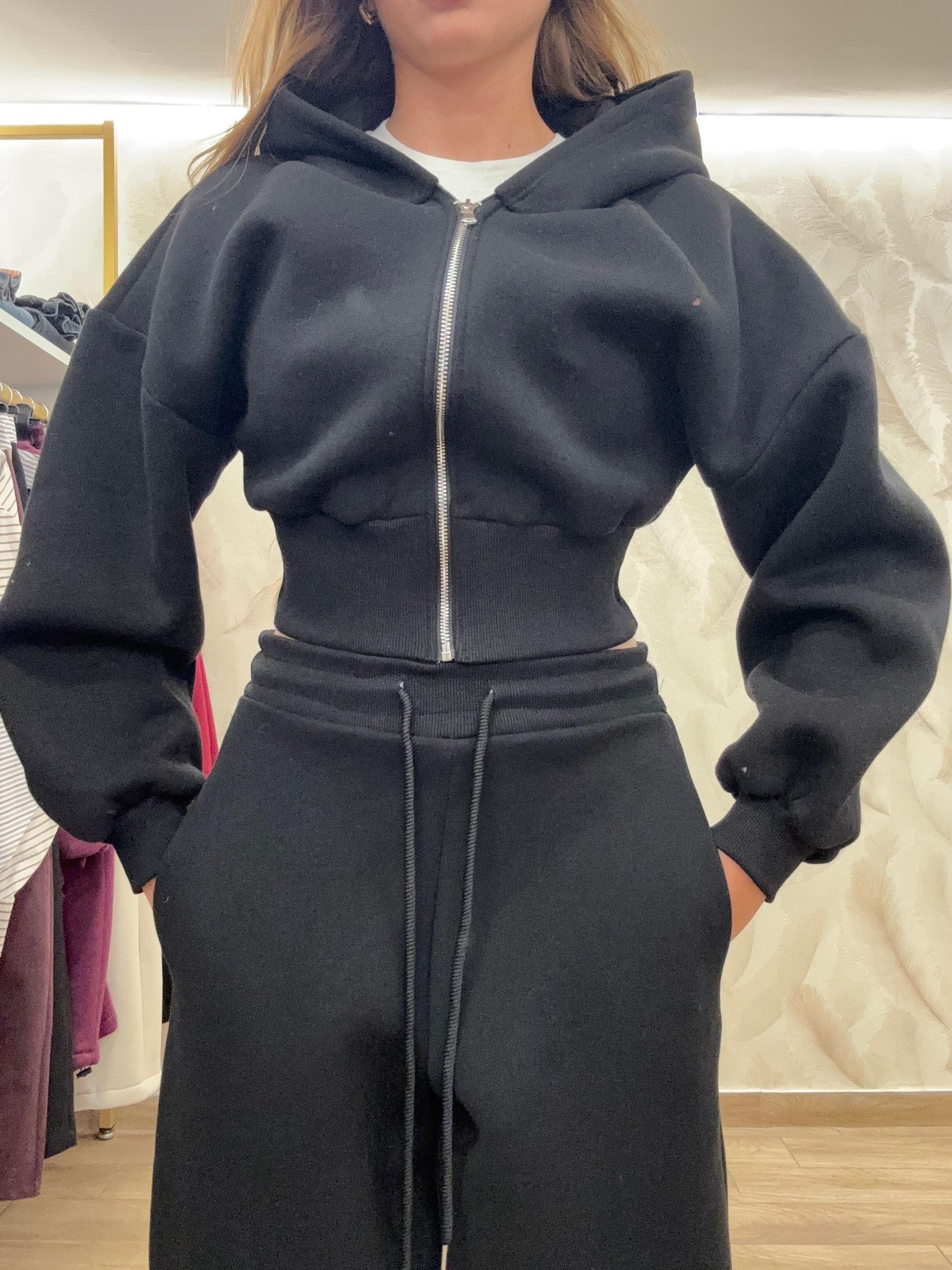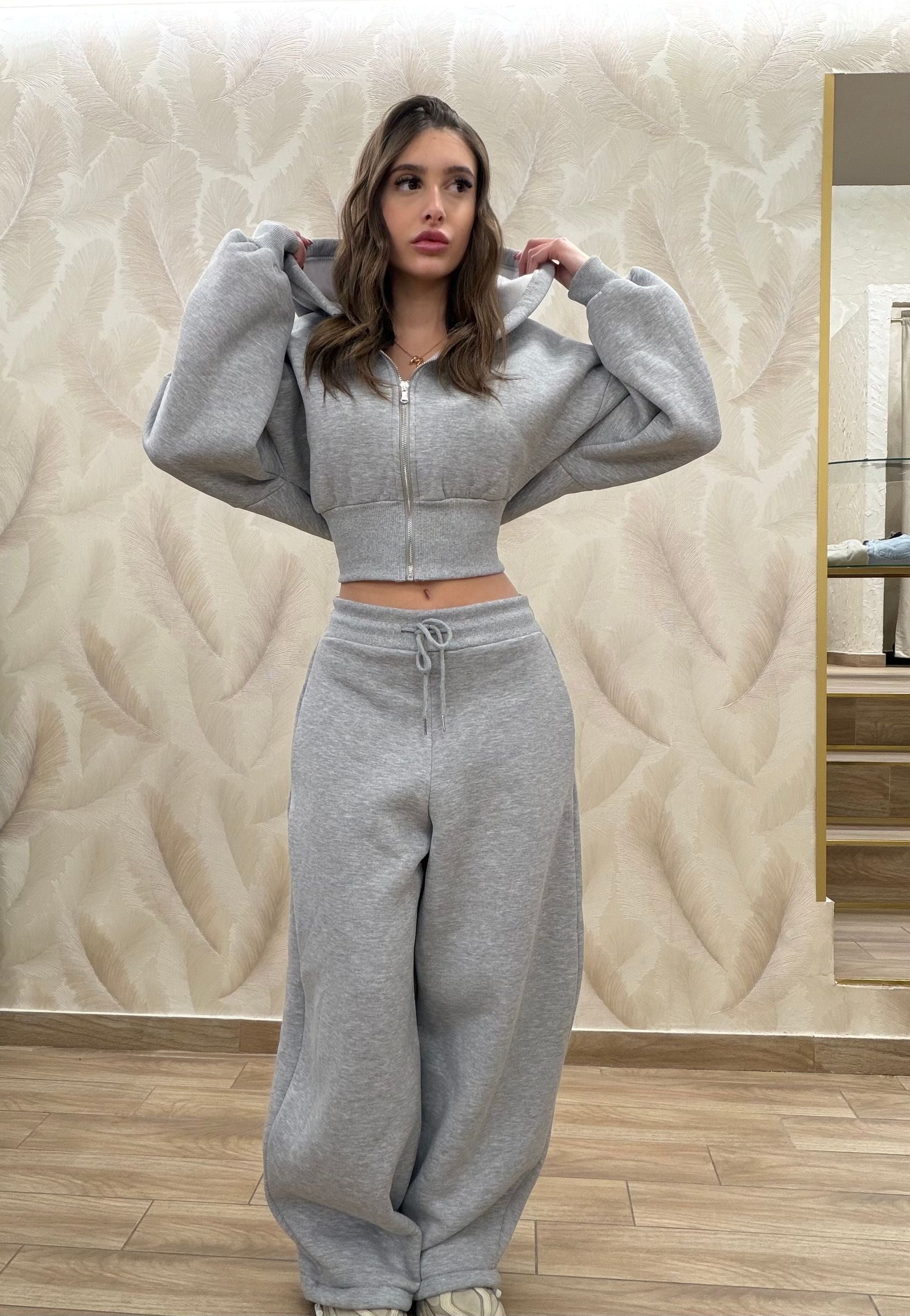 COORDINATO IN TUTA CON FELPA CORTA CON CAPPUCCIO E ZIP E PANTALONE IN TUTA BALLON REGOLABILE SUL FONDO